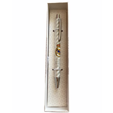 Bolígrafo blanco con escudo Del Real Madrid cuya medida es de 14 cm. Producto oficial.