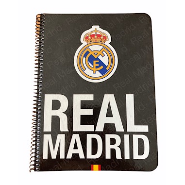 Libreta Real Madrid de color negro y con su escudo en el centro, la libreta es de anillas y mide 21 cm de alto x 15,5 cm de ancho. Producto oficial.